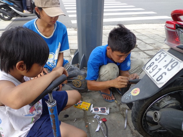 When the official fixer dude was finished fixing my bike he told me the bill would be VND20,000, about US$1. I gave him VND20,000 and the project manager and his assistant another VND20,000.