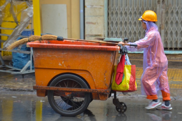 Orange streetsweeper. Not the street sweeper in the marine supply street, just a guy doing his job on an average rainy day in Ho Chi Minh City’s wet season …
