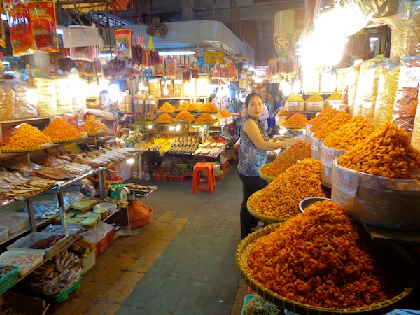 Dried orange. Sun-dried prawns under lights make this whole section of a market glow orange …