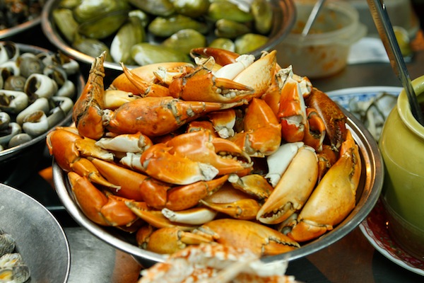 Street food orange. Mud crab claws at a sidewalk seafood joint. Just waiting to be cracked open, rolled in chilli and served.