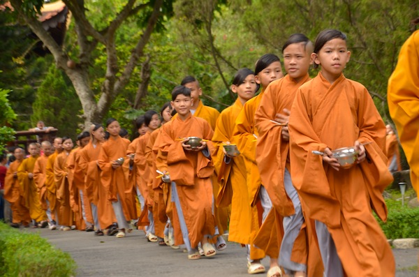 Orange procession. Novice monks on their way to lunch in a temple in southern Vietnam.