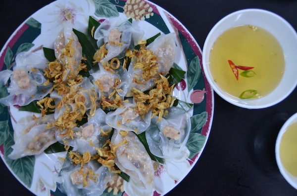 Yes, dear friends, I led my unwitting family into a tourist trap for our first meal in Hoi An. I thought it was a good option because I’d found the recommendation on an obscure Vietnamese website. Darling Man had agreed to trust my research because the dish I was chasing, known as bánh bao bánh vạc in Vietnamese and the very touristy White Rose in English, was more a Chinese dish than a Vietnamese dish. And so he deferred to my supposed greater wisdom (which in this case was simply the result of hours wasting Googling Hoi An food options.)