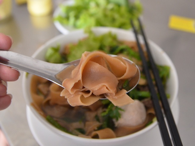 Banh da cua uses an usual type of noodle called (as you probably guessed) banh da. It’s made from the same dough that’s used to make giant rice crackers. The noodles are chewier than other types of rice noodles, with more of a roasted rice flavour.