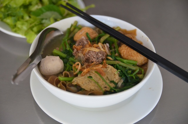 And there’s lots of greenery in this version of the soup. As well as the plate of shredded lettuce and green perilla leaves that’s served alongside the soup, the bowl is stuffed with morning glory, the everyday green Vietnamese vegetable that’s sometimes translated as water spinach.