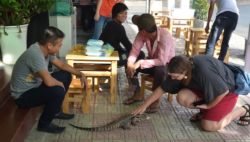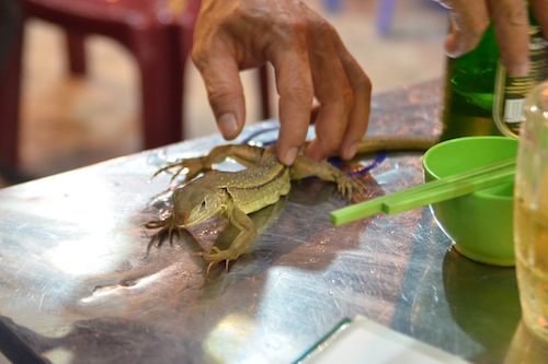We were sitting at a little place overlooking the Ca Ty River, sampling some of Phan Thiet’s local delicacies when we noticed some lizards in a cage behind us.