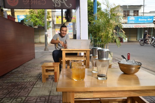 I see a big sign advertising takeaway coffee and I order two serves of Vietnam’s fabulous cà phê sữa đá … to go.