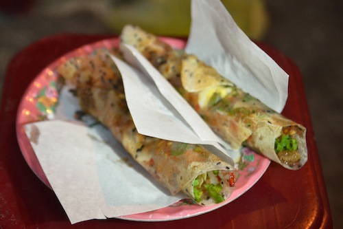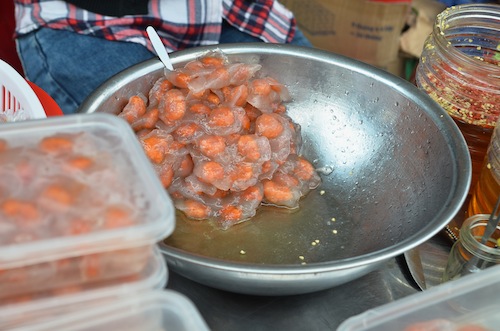 These things tasted AMAZING. A thin sesame-studded rice cracker is coated with a sweet tangy sauce, which makes the cracker pliable. It’s then filled with fermented pork, quail egg, pickled carrot and radish and green onion, rolled and crispied up on the tiny charcoal-burning barbecue.