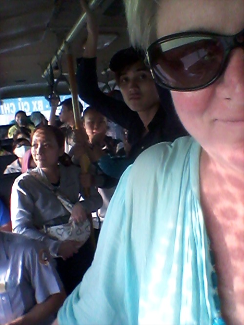 We puttered into the Cu Chi bus station just as a number 13 bus was starting to pull out. Our xe om driver flagged it down, and we boarded — only to find it was standing room only. I must have looked a bit stressed about 1.5 hours of Miss M management standing up because a young guy gave her his seat. I was very very grateful.
