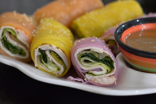 The phở cuốn wrapper is thicker and the dish usually involves sauteed beef and fresh phở herbs. The variants pictured above contains pork, prawn and pho herbs, wrapped with noodle sheets coloured with beetroot, gấc fruit and pumpkin.