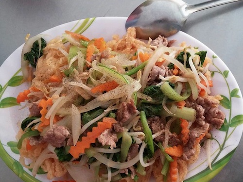 Phở noodles are double-fried to be crispy yet chewy in this dish (gìon means crispy). There is a certain art to juggling all the required steps: frying the fresh phở noodles into crispy cakes, then sauteing beef and onion with the marinade to make a meat and gravy mix. The next step is to add slices of carrot, morning glory and shards of the crispy noodles.