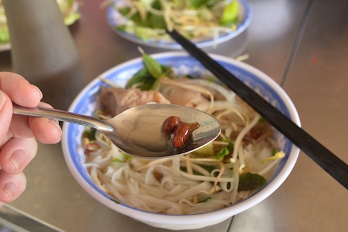 For more advanced phở tasting, you can order tái nạm (a mix of cooked and raw beef), gầu (fatty brisket) and gân (tendon). Phở bò viên (pho with beef balls) isn’t a very common option in Vietnam. It seems to be much more popular in the U.S., Canada and Australia.