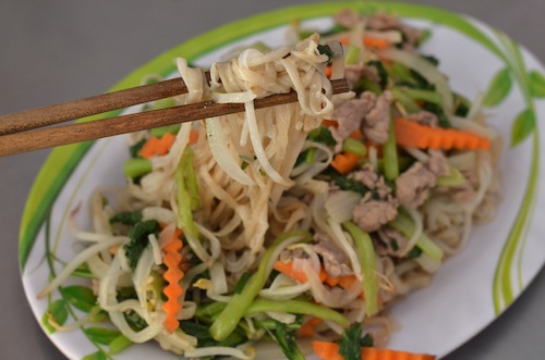 Phở trộn differs from phở xào because only some of the ingredients are stir-fried. Thin slices of beef are seared in a wok with bok choy and onion. The meat and vegetables are then mixed with boiled fresh phở noodles, which should remain soft, not chewy, oily or crispy.
