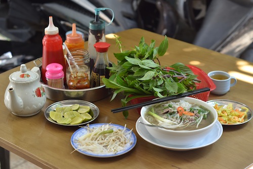 In the phở shops in Ho Chi Minh City, up to three kinds of chilli sauce sit on the table to please the diner. There’s also sliced fresh chilli, wedges of lime, fish sauce, hoisin sauce, pickled garlic, basil, spiky coriander/cilantro, Vietnamese balm and rice paddy herb.