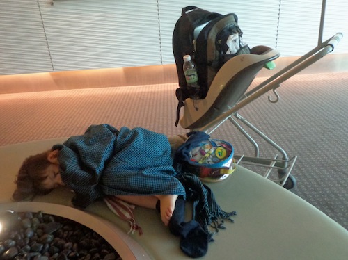 An unexpected night of sleeping at Singapore airport after a delayed flight left us stranded. (Note the travel sarong/blanket).