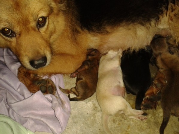 About two months ago, someone left our front gate open. Look what happened. Our dog had puppies. EIGHT puppies. The first one arrived on Saturday morning, just as Darling.