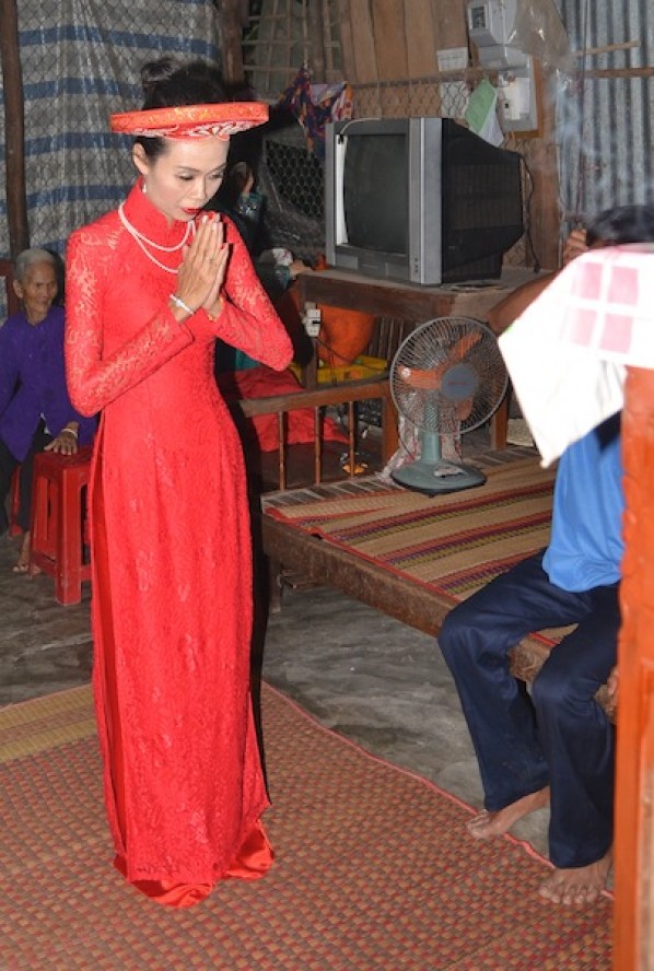 The wedding marquee I’m sitting in stretches over the road. Motorbikes, bicycles and food carts trundle by as wedding guests eat, drink, laugh and take photos of each other..
