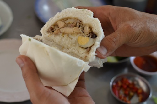 It’s a hefty package of meat and quail eggs encased in a fluffy flour casing, a bundle that’s known in Vietnam as banh bao.