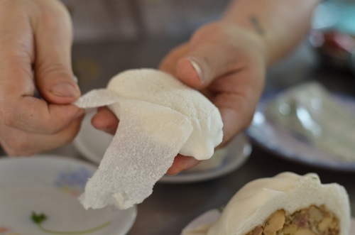 Peeling the skin off, he says, stops the banh bao dough from getting stuck between your teeth.