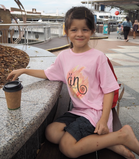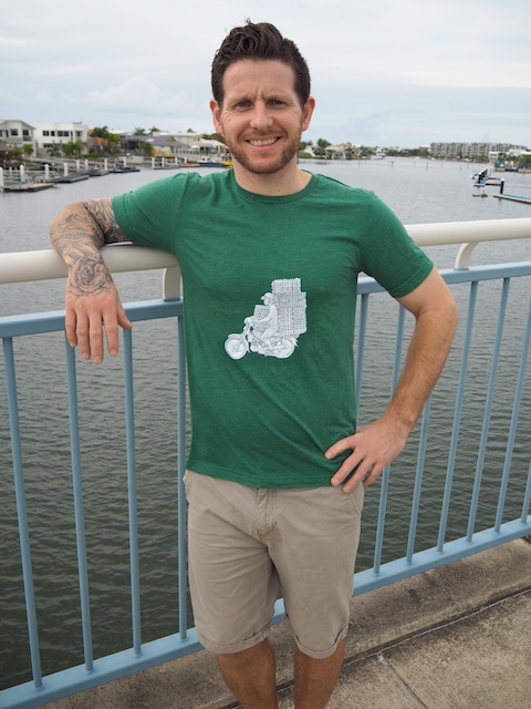 My devilishly handsome Irish brother-in-law agreed to model the t-shirts for me before I left Australia. He’s not a big smiler, our Andy, but he did his best. For the family.
