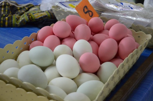 Thai markets are a kaleidoscope of colours, from plasticware to vegetables to eggs. I’ve been wondering about the pink eggs ever since our first trip to a market in.