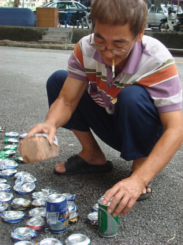 A carpark in Penang’s Batu Ferringhi, across the road from the KFC. A recycled brick, wrapped in a piece of cardboard. A stack of empty beer cans. “Recycle,” the.