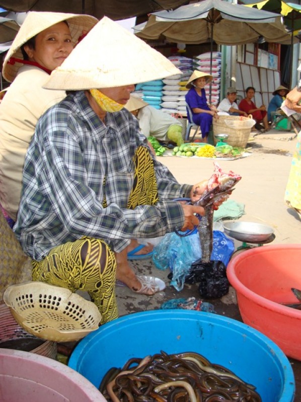 A market in the village of Vinh Long, alongside the mighty Mekong River, similar to wet markets found from one end of Vietnam to another. Fresh produce laid on.