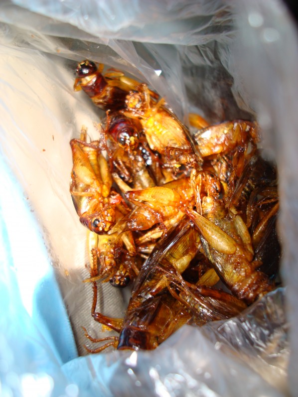 I’m told they’re actually crickets. Bought on the Cambodian side of the border between Cambodia and Vietnam. The transaction took place through the window of our rental car. Darling.